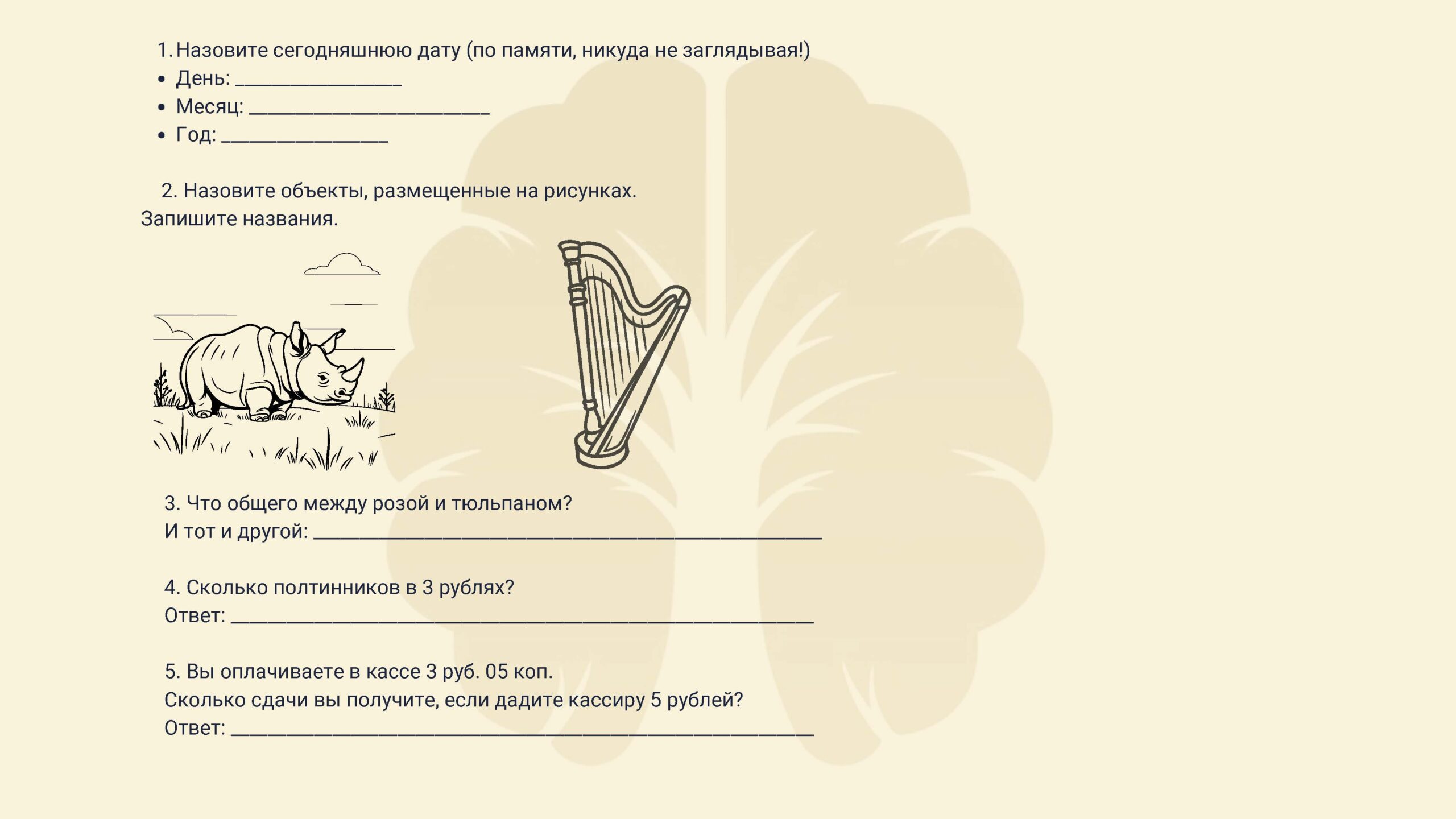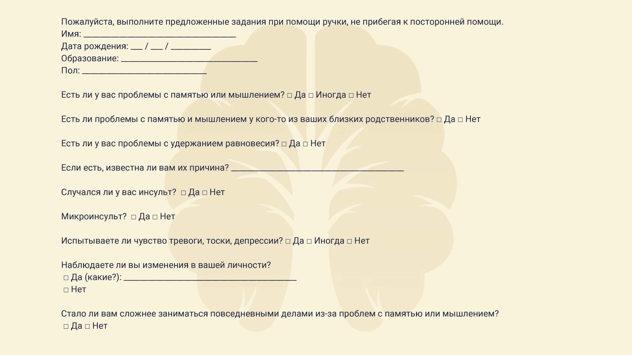 - Малювання годинника (оцінка зорово-моторних навичок).