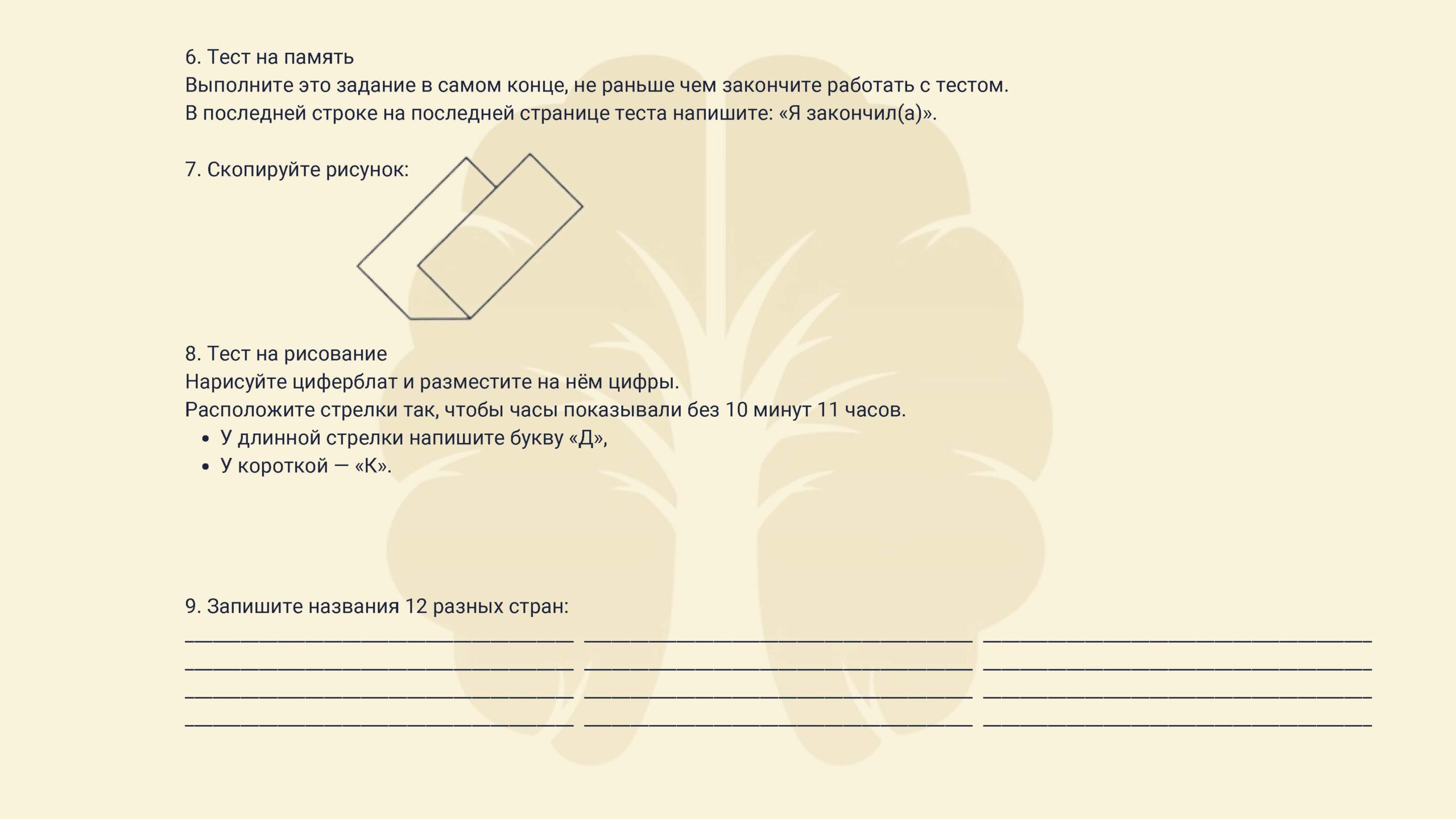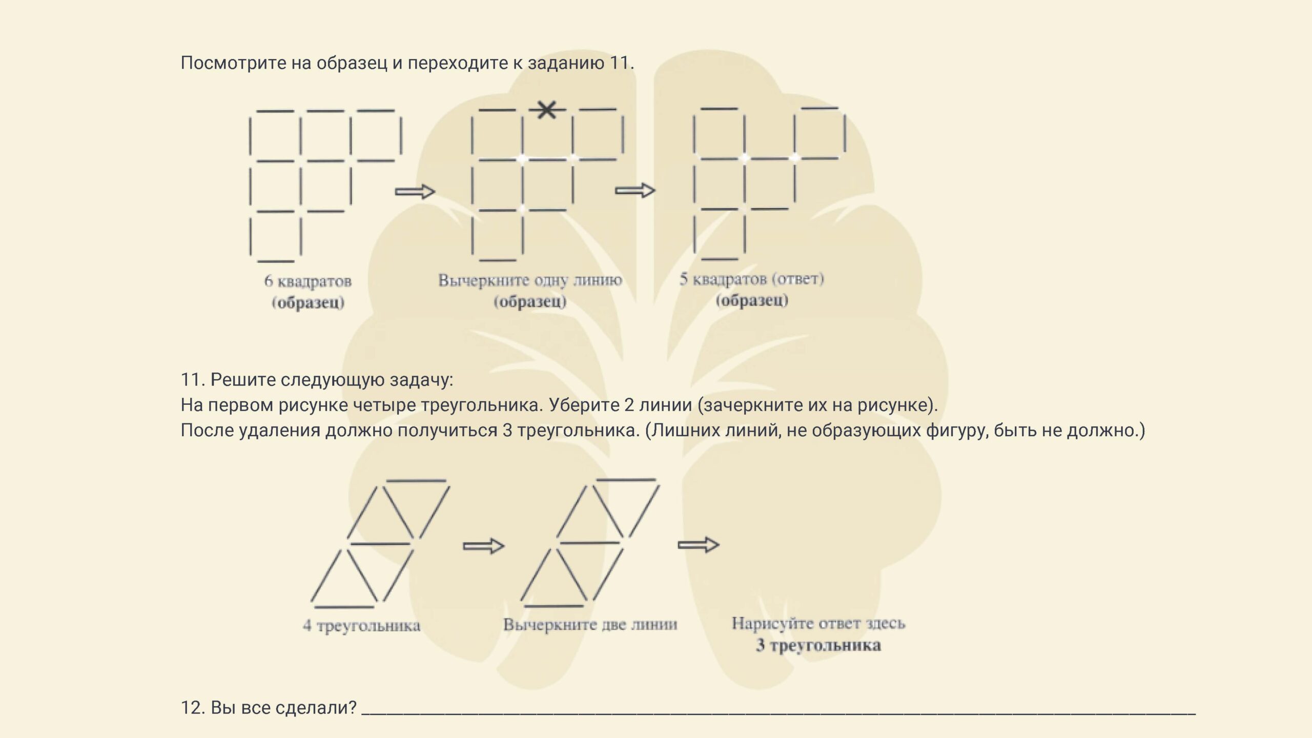 - Оцінює пам’ять, орієнтацію, здібності до абстрактного мислення, виконавчі функції, зорово-просторові здібності тощо.